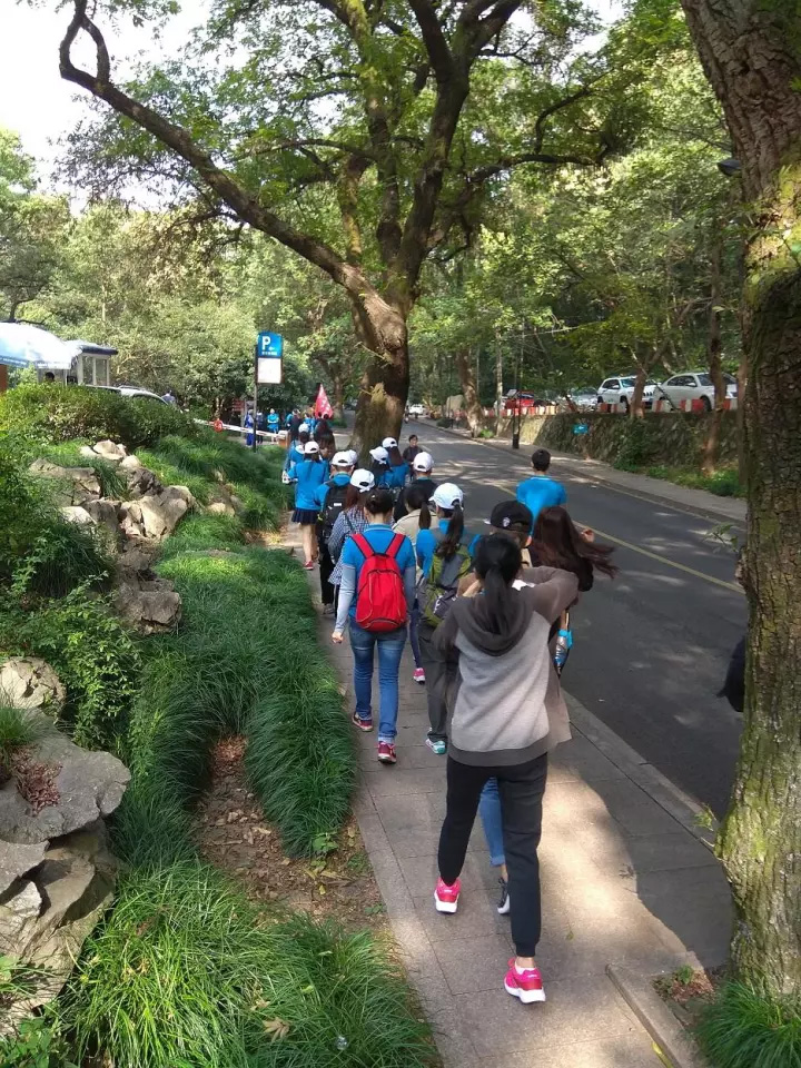 仁本大家庭的伙伴们素质和时间观念就是强,没有人迟到,保证我们9:30准时登山。每个人都穿上了公司的统一服装,点名完毕并分工好,谁带头,谁居中防护,谁押尾等工作安排后,我们就出发了。 还没开始上山的时候,大家步伐还是比较轻快的