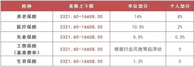 ★以最低缴费基数为例: 需缴纳的社保费=缴费基数×缴费比例 ★以最低缴费基数为例: 养老保险: 单位承担的费用:3321.60元×14% =465.02元 个人承担的费用:3321.60元×8% =265.73元 医疗保险: 单位承担的费用:3321.60元×10.5% =348.77元 个人承担的费用:3321.60元×2% =66.43元 失业保险: 单位承担的费用:3321.60元×0.5% =16.61元 个人承担的费用:3321.60元×0.5% =16.61元 生育保险: 单位承担的费用:3321.60元×1.2% =39.86元 ★以最高缴费基数为例: 养老保险: 单位承担的费用:16608.00元×14% =2325.12元 个人承担的费用:16608.00元×8% =1328.64元 医疗保险: 单位承担的费用:16608.00元×10.5% =1743.84元 个人承担的费用:16608.00元×2% =332.16元 失业保险: 单位承担的费用:16608.00元×0.5% =83.04元 个人承担的费用:16608.00元×0.5% =83.04元 生育保险: 单位承担的费用:16608.00元×1.2% =199.30元