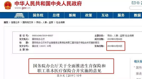 2019年3月月15日,国务院正式发布《关于全面推进生育保险和职工基本医疗保险合并实施的意见》(国办发〔2019〕10号),意见指出,2019年底前实现两项保险合并实施。