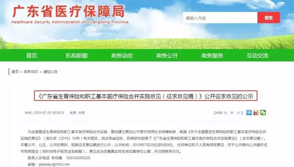 ![]() 就在国家政策发布不久,各地区纷纷响应,出台相应措施。 7月29日,广东省医疗保障局发布《广东省生育保险和职工医疗保险合并实施意见(征求意见稿)公开征求意见的公示》,公示指出:2019年年底广东省将实现,生育保险和基本医疗保险合并实施。