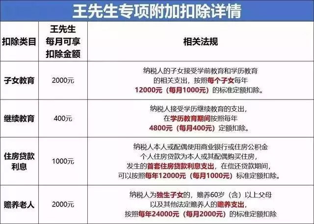 六大扣除可谓是给人民群众减轻了不少负担,据国家税务总局数据显示,前三季度,个人所得税改革新增减税4426亿元,人均累计个税减税1764元,惠及2.5亿纳税人。 国家税务总局局长表示,月收入1万元以下的纳税人,享受赡养老人、子女教育等专项附加扣除后,基本无需缴纳个税。 如果你的收入属于这个区间,就相当于不用交税了! 举个例子:拿一个朋友(王先生)举例!他是一个典型上有老下有小,求学中、背着房贷的伪中产! 王先生背景: √攻读在职研究生 √独生子女且父母已年满60岁 √有两个这正在上学的孩子 √有一套正在还贷款的住房 王先生是如何享受零纳税的: 2018年10月1日前,王先生缴纳个税金额:(10000-3500)*20%-555=745元; 2018年10月1日后,王先生缴纳个税金额:(10000-5000)*10%-210=290元; 根据《暂行办法》,王先生可以享受的是子女教育、继续教育、住房贷款利息和赡养老人4项专项附加扣除。