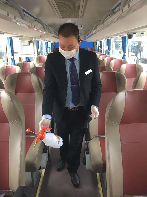 工作人员正在对大巴进行全面消毒 方案策划确认落实,我们始终与客户保持密切沟通,在短短几小时内便确定好首批返杭专车的员工名单,联系好专车大巴,21号下午首辆复工专车终于驶出。 据杭州仁本伍总介绍:此次过程中为了降低人员返程运输的疫情传播风险,都在大巴车上配备了生活物资和防疫物资,并在行前对车辆进行了全面的消毒。车上员工都安排前后错开坐,保持安全的距离,尽量做好每一步防护,确保员工的安全。这一批返杭员工也将在这两天安排体检,没有问题就可以上岗复工了。