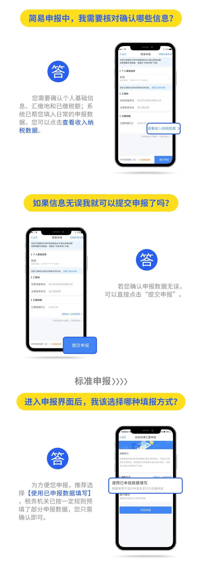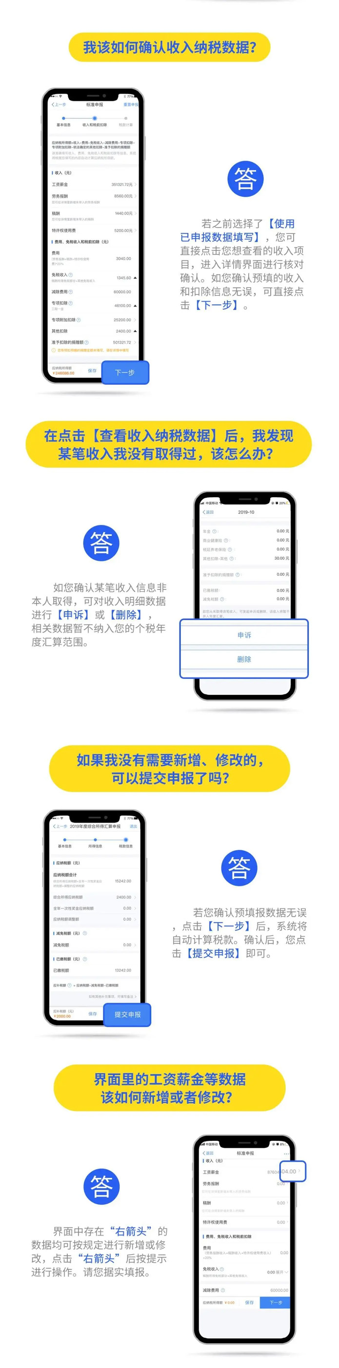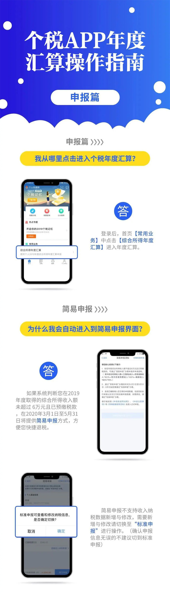 2019年度汇算应退或应补税额=[(综合所得收入额-60000元-“三险一金”等专项扣除-子女教育等专项附加扣除-依法确定的其他扣除-捐赠)×适用税率-速算扣除数]-2019年已预缴税额个人所得税税率表。 以下8种情况可退税 有小伙伴说公式太复杂看不懂,自己也算不出来自己能是不是能退税,能退多少税。 没关系,你只要记住,只要因为平时扣除不足或未申报扣除等原因导致多预缴了税款,无论收入高低,无论退税额多少,都可以申请退税。 实践中,一般有7种情况可能产生退税: 1、2019年度综合所得年收入额不足6万元,但平时预缴过个人所得税的。 举个例子: 小明1月领取工资1万元、个人缴付“三险一金”2000元,假设没有专项附加扣除,预缴个税90元;其他月份每月工资4000元,无须预缴个税。全年看,因纳税人年收入额不足6万元无须缴税,因此预缴的90元税款可以申请退还。 2、2019年度有符合享受条件的专项附加扣除,但预缴税款时没有申报扣除的。 举个例子: 小王每月工资1万元、个人缴付“三险一金”2000元,有两个上小学的孩子,按规定可以每月享受2000元(全年24000元)的子女教育专项附加扣除。但因其在预缴环节未填报,使得计算个税时未减除子女教育专项附加扣除,全年预缴个税1080元。其在年度汇算时填报了相关信息后可补充扣除24000元,扣除后全年应纳个税360元,按规定其可以申请退税720元。 3、因年中就业、退职或者部分月份没有收入等原因,减除费用6万元、“三险一金”等专项扣除、子女教育等专项附加扣除、企业(职业)年金以及商业健康保险、税收递延型养老保险等扣除不充分的。 举个例子:老李于2019年8月底退休,退休前每月工资1万元、个人缴付“三险一金”2000元,退休后领取基本养老金。 假设没有专项附加扣除,1-8月预缴个税720元;后4个月基本养老金按规定免征个税。全年看,该纳税人仅扣除了4万元减除费用(8×5000元/月),未充分扣除6万元减除费用。年度汇算足额扣除后,该纳税人可申请退税600元。 4、没有任职受雇单位,仅取得劳务报酬、稿酬、特许权使用费所得,需要通过年度汇算办理各种税前扣除的。 5、纳税人取得劳务报酬、稿酬、特许权使用费所得,年度中间适用的预扣率高于全年综合所得年适用税率的。 举个例子: 小赵每月固定一处取得劳务报酬1万元,适用20%预扣率后预缴个税1600元,全年19200元;全年算账,全年劳务报酬12万元,减除6万元费用(不考虑其他扣除)后,适用3%的综合所得税率,全年应纳税款1080元。因此,可申请18120元退税。 6、预缴税款时,未申报享受或者未足额享受综合所得税收优惠的,如残疾人减征个人所得税优惠等。 7、有符合条件的公益慈善事业捐赠支出,但预缴税款时未办理扣除的。 8、年终奖税率高于综合所得税率 且年终奖全额并入综合所得后不会提高综合所得税率级数的,在个税汇算清缴时年终奖全年一次性奖金计税方式中选择全部并入综合所得,也有可能会发现应缴纳的税金降低,从而获得退税。 当然,不是所有人都能退税,还有人需要补税。 综合所得年收入超过12万元且年度汇算补税金额在400元以上的纳税人,才需要办理年度汇算并补税。 汇算清缴的操作不能省 还有的小伙伴来问,个税问题太复杂,自己可不可以不去管它,小智很认真严肃地回答你:不可以!!! ■ 退税可以放弃 国家税务总局表示,如果你是属于需要退税的,是否办理年度汇算申请退税是你的权利,无需承担任何责任。 ■ 补税必须办如果你是属于应当补税的,办理年度汇算是你的义务 根据税收征管法第六十二条,纳税人未按照规定期限办理纳税申报和报送纳税资料的,由税务机关责令限期改正,可以处2000元以下的罚款; 情节严重的,可以处2000元以上1万元以下的罚款,并追缴税款、加征滞纳金。滞纳金则从超过缴纳期限之日起,按日加收滞纳税款万分之五。 也就是说,年度汇算申报后,如果你需要补税,请在2020年6月30日前补缴税款,否则将面临每日万分之五加收滞纳金。 附上个税APP年度汇算操作指南