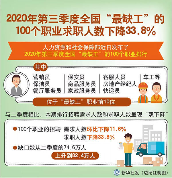 最近一段时间,随着国内疫情的缓解,消费和生产的快速回暖,各行各业的用工需求持续上升,缺口开始变大,甚至是往年春节前才会出现的季节性“用工荒”,今年也大幅提前。 近日,人力资源和社会保障部近日发布了2020年第三季度全国“最缺工”的100个职业排行。