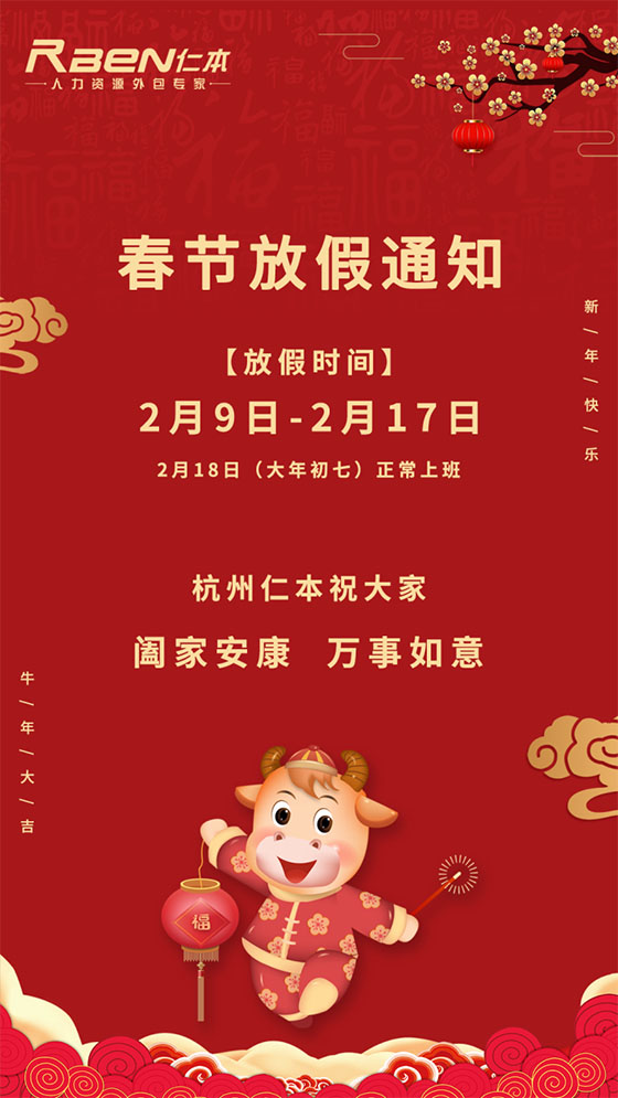 致全体客户、派遣员工: 春节将至,忙忙碌碌的一年即将过去,马上就要迎来全新的辛丑牛年!首先向各位仁本的合作伙伴和全体员工致以节日的问候。 杭州仁本春节假期为: 2021年2月9日——2021年2月17日 2月18日(大年初七)正式上班