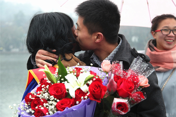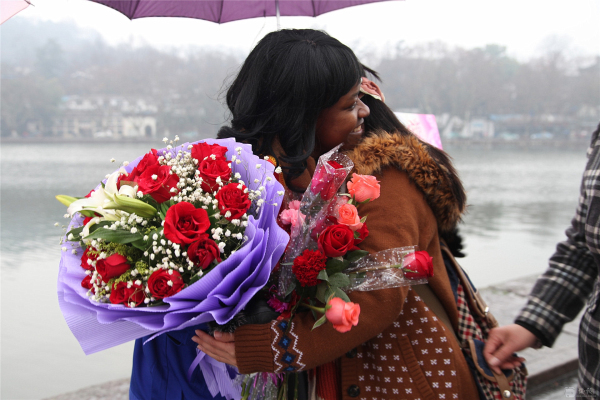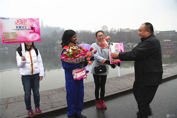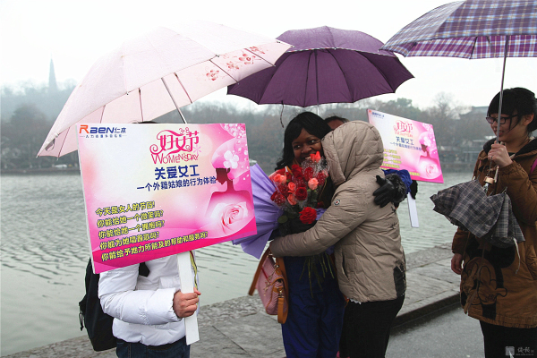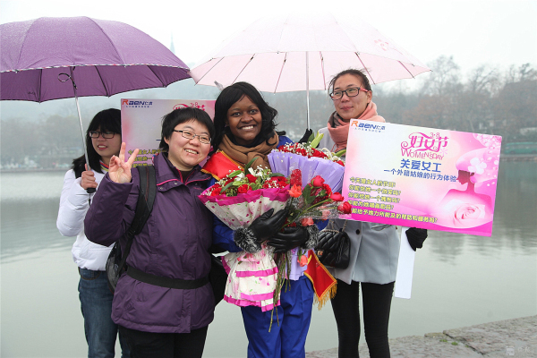 3月8日,国际妇女节。苏堤烟雨,给西湖增添了一份神秘。 行人如织,彰显西湖魅力。而断桥边,一位身材窈窕的黑人姑娘Sisi小姐伫立在细雨中,众多人为她撑起雨伞,无数人给她献上微笑,不断有行人对她热烈拥抱。 这是来自卡麦隆姑娘自发举行的“三八节,关爱女工行为体验”。Sisi ,2012年来中国留学,为了能体验文明的杭州和社会对女性的尊重、对女工的关爱,她萌生了这样的“行为体验”。 据sisi向记者介绍,她的这次主题为:“关爱女工”的行为体验行动,以一个外籍务工者的身份,通过“给女工一个微笑,给女工一个拥抱,给女工唱首歌,给女工一支鲜花,给女工力所能及的服务”的体验,亲身检验一下文明的中国对女工的关爱程度,感受 “上有天堂下有苏杭”的杭州人对女性的爱戴。 当记者问:您通过今天的行为实践,收获了什么?这位性格爽朗的卡麦隆姑娘,一脸微笑,喜形于色,用不很流利的中文对记者说:“哇,中国的朋友真的很热情,杭州的朋友非常友好非常友善非常文明。我很幸福。” 或许她身旁的志愿者夏小姐向记者提供的记录数据更具有说服力:诗诗的行为体验活动只进行一小时,收获鲜花 6束,散花729 支玫瑰,获取1800 多人次的微笑,西湖边下着雨,有56 人次先后为她撑起雨伞,有217人次热情地给她拥抱,有3人现场给她唱歌。” Sisi的脸上难以抑制幸福与兴奋,她活动着胳膊,无不得意地对记者说,“我接受拥抱,累得我胳膊都抬不起来了。”