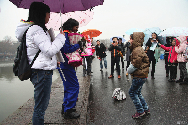 | 外籍女工西湖边“关爱女工”行为体验 游人的热情拥抱累得她胳膊抬不起来 |
