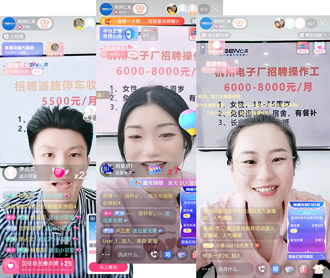 在杭州仁本快手直播间里,我们每天精选高薪优质好工作,给大家详细推荐! 不管你想去电子厂、食品厂、汽配厂还是医疗厂! 不管你是想要找保安、找普工、找保洁、找外卖员! 不管你是想要日结、长期的、暑期的、项目短期工! 杭州仁本统统帮你安排! 直播间里专业的主播帮助大家详细推荐工作,有任何问题都可以在直播间里跟主播交流!美女帅哥主播每天陪你聊天找工作!