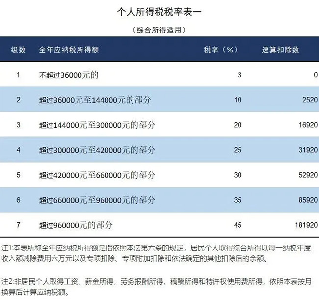 3、综合所得税率表(个税汇算清缴时适用) 综合所得是指居民个人取得的工资、薪金所得;劳务报酬所得;稿酬所得和特许权使用费所得,适用百分之三至百分之四十五的超额累进税率(预扣率表见前述一、二)。