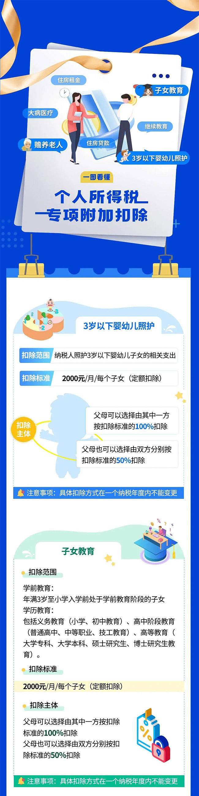 其中明确指出: 强化生育服务支持 …… (三)建立生育补贴等制度。制定生育补贴制度实施方案和管理规范,指导地方做好政策衔接,积极稳妥抓好落实。落实好3岁以下婴幼儿照护、子女教育个人所得税专项附加扣除政策。加大个人所得税抵扣力度。 事实上,早在2023年8月31日,国务院就曾发布《关于提高个人所得税有关专项附加扣除标准的通知》,就“提高3岁以下婴幼儿照护等三项个人所得税专项附加扣除标准”作出明确规定: