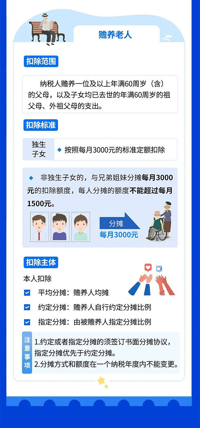政策内容: 一、3岁以下婴幼儿照护专项附加扣除标准,由每个婴幼儿每月1000元提高到2000元。 二、子女教育专项附加扣除标准,由每个子女每月1000元提高到2000元。 三、赡养老人专项附加扣除标准,由每月2000元提高到3000元。其中,独生子女按照每月3000元的标准定额扣除;非独生子女与兄弟姐妹分摊每月3000元的扣除额度,每人分摊的额度不能超过每月1500元。 四、3岁以下婴幼儿照护、子女教育、赡养老人专项附加扣除涉及的其他事项,按照《个人所得税专项附加扣除暂行办法》有关规定执行。 五、上述调整后的扣除标准自2023年1月1日起实施。 专项附加扣除每个月标准提高,意味着能够享受上述扣除的纳税人,可以扣除更多的应纳税额,从而少交个税,增加到手收入。 那么,调整后,每个人到底可以增加多少收入?这跟每个人的具体情况息息相关。 02、到底能增加多少收入? 由于目前一年个税起征点(基本减除费用)为6万元,再叠加7项专项附加扣除等各类扣除项目,实际起征点更高。 对于无需缴纳个税的人群,“一老一小”扣除标准提高与否,对他们并无影响。真正影响的是缴纳个税且有老人孩子的纳税人。 对于这些人而言,假如有两个孩子,“一老一小”扣除标准每月提高1000元,最高能比之前多享受每月3000元个税扣除额,一年则是36000元。如果该人适用最高的45%个税边际税率,那么,理论上可享受1.62万元个税减税额。当然,如果有更多的孩子,可以享受更高的扣除额度,到手收入会更高。 不过,赡养岳父母或公公婆婆是不能享受赡养老人专项附加扣除的。根据现行政策规定,赡养老人专项附加扣除政策中的老人(被赡养人),是指年满60岁的父母,以及子女均已去世的年满60岁的祖父母、外祖父母,不包括配偶的父母。 03、最全个人所得税扣除项目