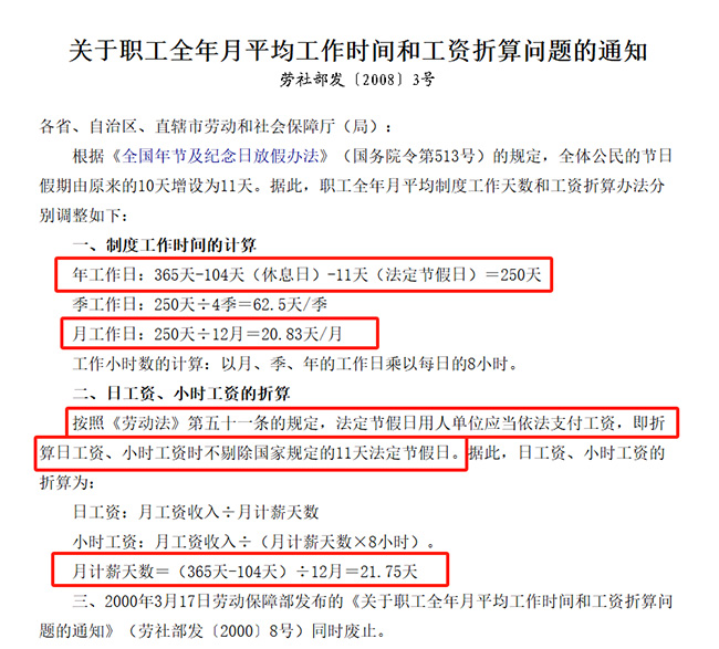二、职工全年月平均工作时间和工资折算(新算法): 1、制度工作时间的计算 (1)年工作日:365天-104天(休息日)-13天(法定节假日)=248天 (2)季工作日:248天÷4季=62天/季 (3)月工作日:248天÷12月=20.67天/月 (4)工作小时数的计算:以月、季、年的工作日乘以每日的8小时 2、日工资、小时工资的折算 按照《劳动法》第五十一条的规定,法定节假日用人单位应当依法支付工资,即折算日工资、小时工资时不剔除国家规定的13天法定节假日。据此,日工资、小时工资的折算为: (1)日工资:月工资收入÷月计薪天数 (2)小时工资:月工资收入÷(月计薪天数×8小时) (3)月计薪天数=(365天-104天)÷12月=21.75天 可以看到的是,月工资计算天数没有变化。 加班工资计算 依据《工资支付暂行规定》第十三条:用人单位在劳动者完成劳动定额或规定的工作任务后,根据实际需要安排劳动者在法定标准工作时间以外工作的,应按以下标准支付工资: (一)安排劳动者延长平日工作时间的,支付劳动者工资的150%的工资报酬; (二)休息日安排劳动者工作又不能安排补休的,支付劳动者工资的200%的工资报酬; (三)法定休假日安排劳动者工作的,支付劳动者工资的300%的工资报酬。 目前现行算法是: 加班工资=月薪÷21.75×加班天数×所对应的倍数 以上“工资”指的是劳动合同所签订的总额,如果劳动合同的工资分为“基本工资”、“岗位工资”、“职务工资”等,应当以各项工资的总和作为基数计发加班费(包含奖金、津贴、补贴等),不能以单独一项作为计算基数。 |