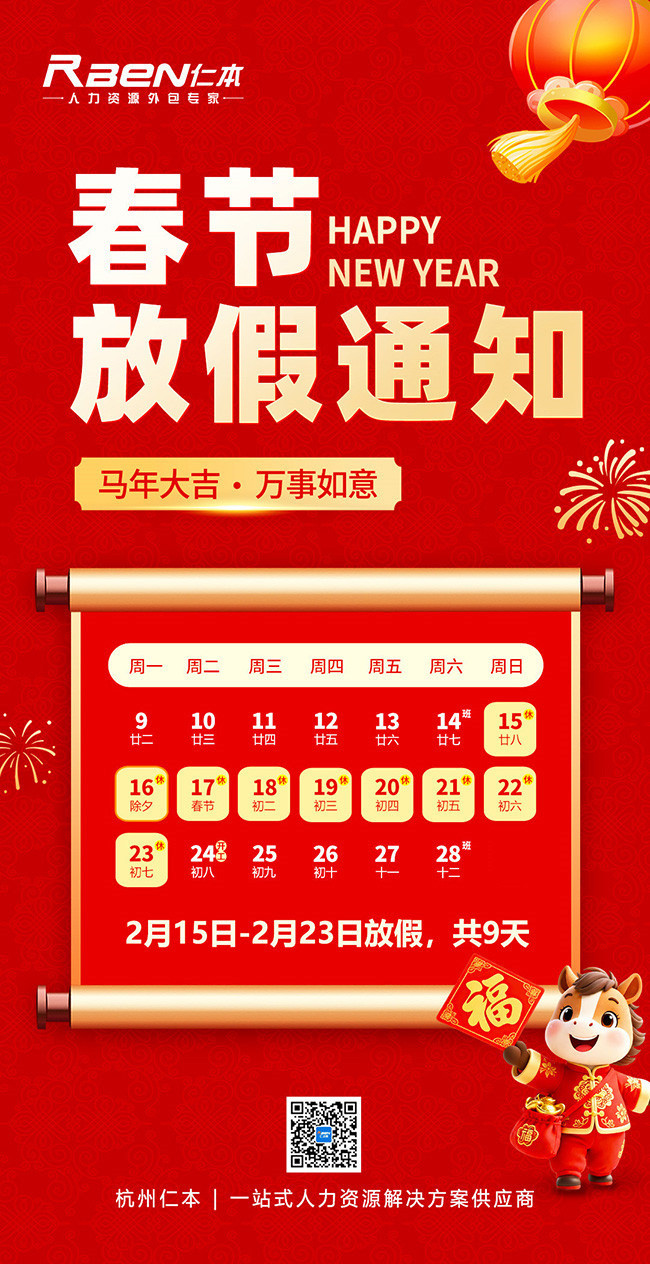 杭州仁本2026年春节放假通知:
