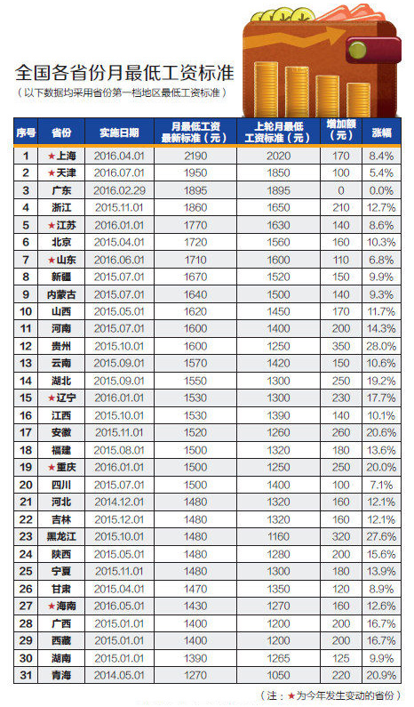 你所在的省份最低工资标准还调整吗?凡是跟钱有关的政策调整很多人都很关注。据记者查阅公开报道统计,截至5月26日,全国已有山东、上海、天津、江苏、辽宁、重庆、海南等7省份对今年最低工资标准作了明确。 “在当前经济增速明显下滑的情况下,可以适当减慢调整最低工资标准的次数,合理降低最低工资标准调整的幅度”,中国劳动学会副会长苏海南接受记者采访时表示,“面对经济增速放缓的形势,为贯彻中央关于‘降成本’的要求,需要对现行有关规定和做法进行研究调整。” 已有7省份上调最低工资标准,最高最低省份差920元 截至5月26日,已有山东、上海、天津等7省份明确上调最低工资标准,还剩24个省份未宣布上调最低工资标准(见图表,标红五角星的是今年调整的省份)。而在过去的2015年,全国至少有28个地区上调最低工资标准,上调的地区数量大大超过2014年。 目前,全国最低工资标准整体的状况是:上海最低工资标准每月2190元,为全国最高,比位居第二位的天津高出240元,比位列第三位的广东省高出295元;青海的最低工资标准为1270元,为全国最低。 上海的最低工资标准之所以拔得头筹,似与经济总量相关。翻看上海市2015年的GDP总量接近2.49万亿元,比同为直辖市的北京(2015年的GDP总量为2.29万亿元)高出0.2万亿元,相应的,最低工资标准也高出北京470元(北京2015年最低工资标准为1720元)。北京与上海的最低工资标准差距可谓不小。 而上海跟同为直辖市的天津相比,其最低工资标准差距却没有北京大。尽管天津2015年的GDP总量只有1.65万亿元,上海高出天津0.84万亿元,而天津2016年的最低工资标准为1950元,上海仅高出天津240元。 同为直辖市的重庆的最低工资标准就更不乐观了。重庆2015年的GDP总量是1.57万亿元,经济体量与天津相当,与上海的差距为0.92万亿元,但是重庆2016年的最低工资标准仅为1500元,天津比重庆高450元,上海比重庆高690元。 如果简单地从经济总量数据上分析,与上海相比,北京、重庆的最低工资标准都还有上涨的空间。 其实,上海不仅最低工资标准在全国拔得头筹,最低工资标准的含金量也最高,这里说的含金量是指到手的纯收入。上海明确规定,月最低工资标准不包含个人依法缴纳的社会保险费和住房公积金;延长法定工作时间的工资;中班、夜班、高温、低温、井下、有毒有害等特殊工作环境、条件下的津贴;伙食补贴(饭贴), 上下班交通费补贴, 住房补贴。 值得注意的是,在榜单中,青海省的最低工资标准全国最低,为1270元,与最高的上海相差920元。查看2015年青海省的GDP总量为0.24万亿元,在全国排倒数第二,似乎最低工资跟当地的经济增速也密切相关。 对此苏海南告诉记者,各省份在调整最低工资时不仅考虑经济增长速度,还需综合考虑包括物价上涨情况、社会平均工资提高以及就业状况等多种因素。他同时建议,有条件的地方,还是要适时合理提高当地最低工资标准,毕竟这与2013年出台的《关于深化收入分配制度改革的若干意见》提出的要“促进中低收入职工工资合理增长”的说法相一致;但各地在调整最低工资标准时,一定不能再像有的地方前几年那样去与周边地区搞攀比,一定要把握好度,既要努力保障提供正常劳动的低收入劳动者实际生活不下降,同时要避免给企业形成过大压力。