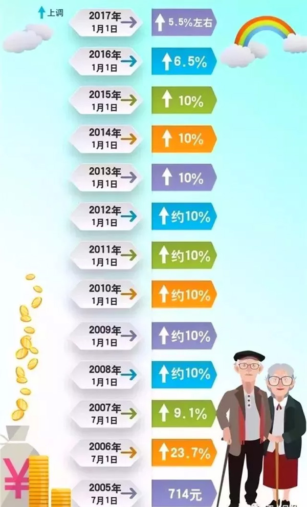 一、养老金十四连涨,2018年涨幅5% 此次调整,继续统一采取定额调整、挂钩调整与适当倾斜相结合的调整办法。定额调整体现社会公平,同一地区各类退休人员调整标准基本一致;挂钩调整体现“多缴多得”“长缴多得”的激励机制,使在职时多缴费、长缴费的人员多得养老金;适当倾斜体现重点关怀,主要是对高龄退休人员和艰苦边远地区退休人员等群体予以照顾。 自2005年以来,我国养老金已连续上调14年,实现“十四连涨”。此次调整预计将有1.14亿名退休人员受益。