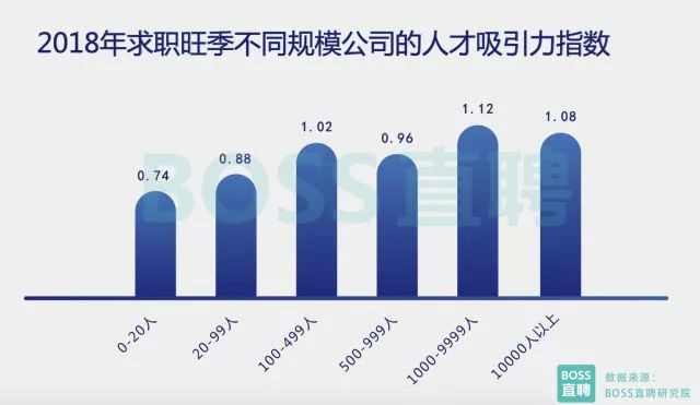 从求职者期望薪资的角度观察,2018年前两个月,全国50城求职者平均期望薪酬为9051元,同比增长3.3%。 期望月薪在1万元以上的求职者比例从2017年的27.3%升至28.4%;期望月薪在2万元以上的求职者比例上升0.2个百分点至6.5%,而期望月薪不足5000元的求职者比例同比下降1.6个百分点。 人才求职心态趋稳 中小企业加薪抢人 BOSS直聘研究院发现,在2018年跳槽旺季,1000-9999人规模的公司由于发展稳定系数高,且应聘难度及竞争压力略低于万人大厂,最受求职者欢迎。相比之下,中小企业在这个旺季依然面临人才难求的困境。 100人以下的初创企业,人才吸引力不足0.9,大幅低于千人以上公司,20人以下的初创企业人才吸引力仅为0.74,反映出在近几年竞争趋于白热化,各细分领域排位逐渐清晰,资本集中向头部企业倾斜的环境下,人才整体求职心态更趋于稳定。