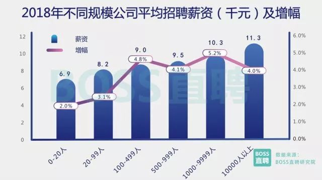 为了缓解人才招聘困境,具有一定实力的中等规模公司开始通过调整薪资争抢人才,这一幕和4年前移动 互联网创业大潮刚刚开始的时候十分相似。2018年,100-499人规模的企业,平均薪资增幅为4.8%,高于一万 人以上规模的巨头,仅次于处在最旺盛发展阶段的1000-9999人企业。