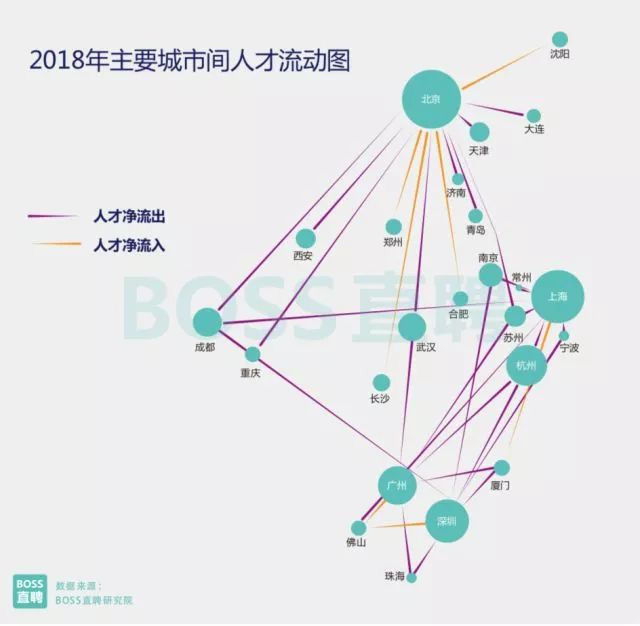 2 人才间的城市移动 新一线城市人才争夺战加剧 杭州武汉成都郑州西安成第一集团 2017年,随着“新一线”城市人才吸引政策的集中出台,城市间“抢人集团”的排位雏形已经显现。 BOSS 直聘研究院数据显示,2018年前两个月,一线城市(北上广深)人才继续流出至二三线城市,净流出率达到 0.6%,较2017年同期增加0.05个百分点。 相应地,二线城市人才吸引力也继续增强,其中杭州、武汉、成都、郑州、西安五个城市人才吸引力最高,2018年离开北上广深的求职者,有35.5%的人选择了这五所城市。而且,这一趋势已经在18个月左右的区间里相对稳定,这五个城市成为“新一线”城市抢人的第一集团。