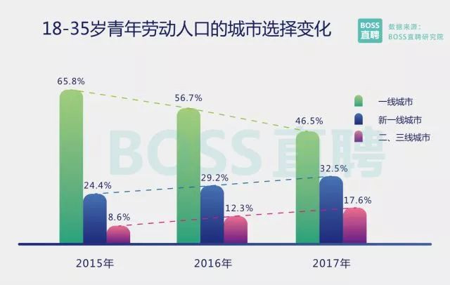 尽管二线城市人才数量快速上升,但在人才质量方面,二线城市还和一线城市有明显差距。 BOSS直聘数据显示,2018年旺季,从事互联网、金融、专业服务等高薪行业且学历为硕士以上的人才,超过八成仍然选择在 一线城市打拼。 仅46.5%的18-35岁青年劳动者首选一线城市 BOSS直聘研究院数据显示,近三年来,工作首选城市为北上广深的18-35岁青年劳动者比例迅速下降,从 2015年的65.8%下降至2017年末的46.5%。选择新一线城市的青年劳动者比例直线上升,选择二三线城市的年轻 人比例也较2015年翻倍。