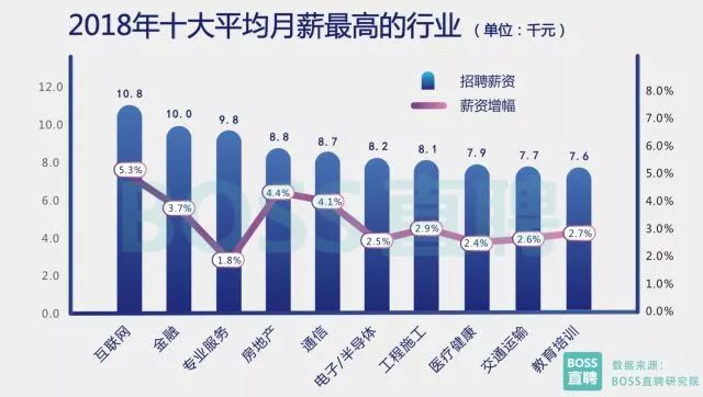 随着第三产业在我国GDP中所占比重的连年提升,特别是城市服务业的迅猛发展以及社会消费意愿的提升, 不仅仅是一线城市,二三线城市的生活服务业同样出现较大的岗位空缺,“用工荒”现象在开年后较为明显。 而在求职旺季,工程施工相关人才的相对紧缺,一定程度上反映出“一带一路”大背景下,基建项目整体需求的提升,以及基建投资在今年“降速提效”的新特征。 产业间薪酬分化进一步加剧 BOSS直聘研究院数据显示,2018年前两个月,各产业间平均薪资水平的分化进一步加剧,排名第一的互联 网行业,平均薪酬是排名末尾的食品/饮料行业的1.79倍,较2017年同期增加0.06倍。 传统高薪三巨头行业互联网、金融、专业服务稳坐前三,平均月薪较其他行业高出1000元以上。 房地产、通信互换位置,排名四五, 虽然在薪资基数上与前三仍有差距,但薪资增幅仅以微弱劣势稍低于互联网。