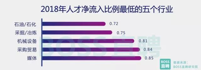 在新兴行业冲击下,传统行业正在面临愈发严峻的人才危机。BOSS直聘研究院数据显示,以能源/化工为代 表的部分传统行业,人才净流出比例正逐渐走高。 这种情况的出现,一方面与部分传统行业集中去产能和自动 化水平升级,导致岗位需求下降有关,另一方面也与新兴行业表现强势,人才吸引力超过传统行业有很大关系。
