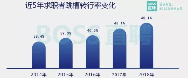 BOSS直聘研究院发现,石油/石化和采掘/冶炼行业人才的流入/流出比连续三年下降,2018年跌破0.75。 而过去几年人才吸引力尚能保持在中游位置的传统媒体,人才流失率首次进入倒数五位。 人才转行情况更加普遍 产业间流动迅速增长 随着新兴行业的崛起以及行业间薪酬分化加剧,人才转行率正加速上升。 BOSS直聘研究院数据显示,2018 年,全行业人才整体转行率已达45.1%,较5年前增加近7个百分点,转行现象正变得愈发普遍,产业间的人才流 动正在迅速增长。