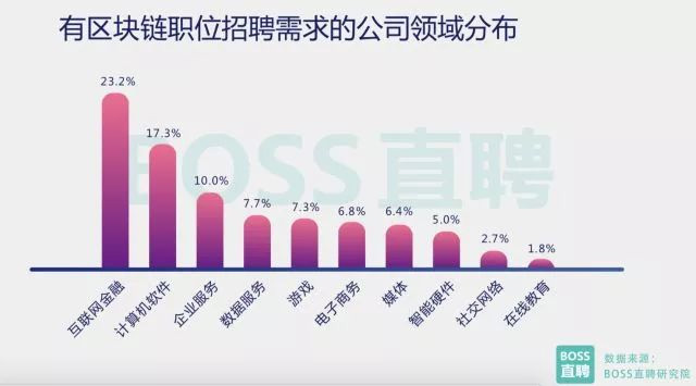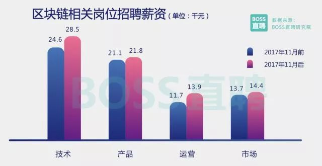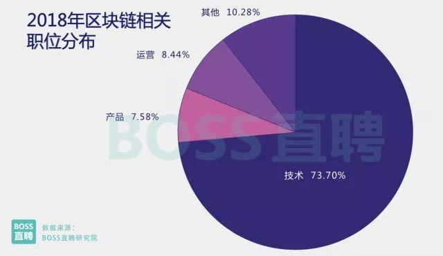 与海外相比,国内区块链人才供应增长态势较为稳定。2018年前两个月,人才供应量同比增加235%,增速 虽高于其他互联网职位,但存量仍远低于实际需求。 截至2018年2月,专业区块链技术人才的供需比仅为0.15,严重不足(人工智能相关人才的供需比为0.62。 人才供需比低于1说明人才供不应求,数值越低表明缺口越高)。 2017年11月之前,区块链相关岗位的平均招聘薪资为2.32万元。2017年11月之后,区块链相关岗位的平均 招聘薪资达到2.58万元。 2、区块链相关岗位类型和地域分布 区块链成为风口之后,圈内不可避免地出现一些挂羊头卖狗肉的蹭风口型岗位,只是加上区块链三个字, 薪资便能提升一截。 然而BOSS直聘研究院通过技能与职位相关性分析发现,目前市面上的擦边球岗位并不多, 90%的职位为专业区块链相关岗位。 从职位分布上看,有73.7%的区块链相关岗位为技术类,7.5%为产品类、 8.4%为运营类,还有10%其他岗位(包括行业分析师、市场推广、记者等)。