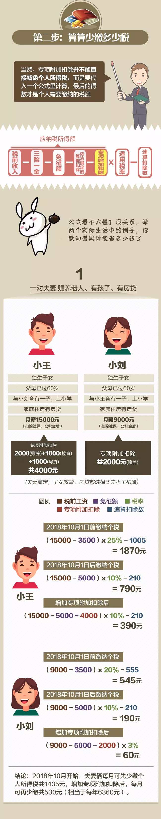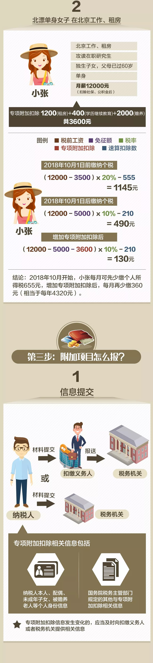 10月20日)起,财政部、国家税务总局会同有关部门起草的《个人所得税专项附加扣除暂行办法(征求意见稿)》(以下简称《暂行办法》)在两部门官网向全社会公开征求意见,之后,将依法于2019年1月1日起实施。 《暂行办法》明确了个人所得税法规定的子女教育、继续教育等6项专项附加扣除的具体实施办法。享受这些专项附加扣除,需要哪些条件?通过这些扣除项目,纳税人可以少缴多少个税?跟随下面这张图,一起来算算。