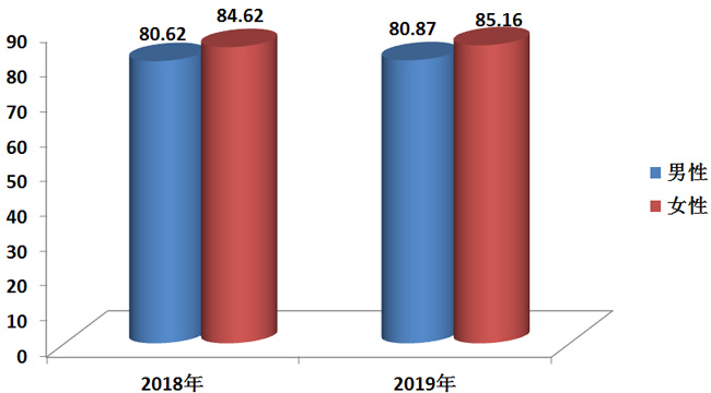 杭州市男性、女性人均期望寿命有差别,差距有所扩大。其中2019年全市男性人均期望寿命为80.87岁,女性85.16岁,比2018年分别增加0.25岁和0.54岁。男女人均期望寿命差距为4.29岁,比2018年4岁差距扩大了0.29岁。 重大慢性病过早死亡率为7.20%
