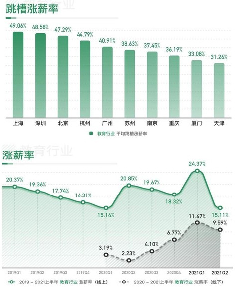 2021上半年互联网行业薪酬数据 一线城市跳槽涨薪率也回落到35%上下。正式宣告疫情对于互联网的影响宣告结束,一切回归平常。 这一波大起大落,算是在极短时间经历了行业危机、新风口出现、疯狂抢人、行业洗牌、回归正常。一场大戏,再次证明了,只有潮水褪去才知道谁在裸泳,精彩绝伦,能够看到一次何其有幸,但还是希望疫情这样的危机不要再出现了。 2、 教育行业 相较于其他行业的“独角戏”,教育行业简直是双主角模式,而且两位主角的境遇可谓一个天堂、一个地狱。这两位主角分别是线上教育、和线下教育。