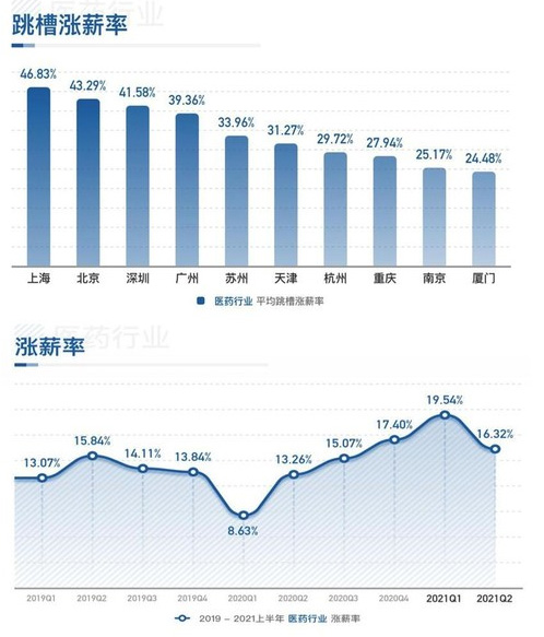 2021上半年教育行业薪酬数据 疫情对于线下教育的打击算是一击致命,一瞬间致死,毫无还手之力,加之国家对于课外培训的打击力度, 2020年四个季度的涨薪率瞬间从2019年的平均15%上下,跌至3.19%、2.23%、4.10%、6.77%,线下教育迎来了至暗时刻。与此同时,线上教育板块,瞬间引来爆发。原来被大家嫌弃的没有学习氛围、效率低下、专业度不够等等缺点,统统变成了“真香”。所以薪智人经常说,没有差的模式,只有没找对的应用场景。此轮爆发过于突然,市场相关人才储备非常不足,抢人大战使得2020年线上教育涨薪率达到了15.14%、20.85%、19.67%、18.32%。 随着疫情的影响逐渐减退,线下教育市场开始回暖,国家严控课外培训,大家就开始转型兴趣培训,在“被憋疯”的家长和小朋友的推动下体育类、音乐类、美术类培训迎来爆发。市场薪酬涨薪率也在2021年第一、第二季度回到了11.67%、9.59%,虽然没有回到2019年的平均水平,但是势头回来了,面包总会有的,一切都会有的。反观线上教育,可谓“一地鸡毛”,乱象丛生,经历了洗牌,行业也逐渐回归理性,2021年第二季度涨薪率也回到了15.11%。 但是,说教育行业已然完全回归理性还为时尚早,北上深的跳槽涨薪率依然高达近50%,这还是非常不正常的数据,希望线上教育能借势蓬勃发展,而不是“作茧自缚”。 3、 医疗、医药行业 疫情一来,医疗、医药行业让大家看到:什么叫国之重器啊?(战术后仰)。在此先向所有疫情期间奋战在一线的医务人员、疫苗研发的一线工作人员致以最高敬意,感觉讨论涨薪率真的贬低了大家的贡献。 但毕竟数据解读,还是要看一下市场数据,2021年第一、第二季度的涨薪率达到了19.54%、16.32%,这个数据说明医药行业的热度还没有褪去,从跳槽涨薪率北上深都超过40%也可以证明。