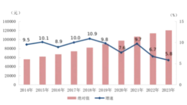 2023年,全国城镇非私营单位就业人员年平均工资为120698元,比上年增加6669元,名义增长5.8%,扣除价格因素实际增长5.5%。