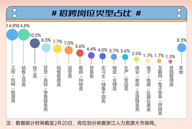 软硬件综合开发工程师、外贸运营专员、招商运营专员……2月20日9时至12时,杭州市高校毕业生就业专场招聘会在杭州市人才市场举行,77家参会企业累计提供248个岗位和1661个用人需求。以这场招聘会为代表,今年春节假期后,杭州启动“新春引才服务月”活动——2月6日至3月7日,杭州市级层面平均每2天就有1场招聘活动。 在这场春日的人才盛宴中,既有老牌巨头抛出的“橄榄枝”,也不乏新兴企业开出的6万月薪“英雄帖”。当下招聘会的展位还在更新,为每一位追梦人铺设通向未来的快车道。我们梳理了杭州人才网活动主页内的17场招聘会信息,为来杭求职者提供一份求职“秘籍”。 去“杭州六小龙”工作还有机会吗? 人才需求总量突破3.5万人 作为开年引才的重要节点,本次“新春引才服务月”的每一场招聘活动都诚意满满,争取满足不同求职者的多重选择。在总计17场招聘活动中,1500余家参会企业累计释放优质岗位超2600个,人才需求总量突破3.5万人。观察发现,制造业、互联网及科创企业,可谓是系列招聘会中的“三巨头”,参与企业数量占比超五成,“租赁和商务服务业”“批发和零售业”紧随其后,分别占比8.8%和7.3%。