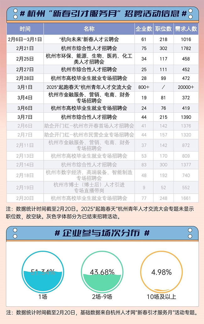 不只有常见的岗位,统计还发现,本次“新春引才服务月”活动中还有诸如“白领育儿师”“养老规划师”“健康管理师”等新兴职业引关注。如有公司拟招聘20位“白领育儿师”,以“指导宝妈科学母乳喂养的方法”;有公司拟招聘10位“废旧办公家具回收与再利用技术”方向的博士,重点“研制木质家具一体成型”等技术……小众新兴职业需求让就业市场的生态更加多元和丰富。 错过招聘会还有机会吗? 云招聘、直播带岗等形式打破限制 刚在网上看到适合自己的心动企业、心动岗位,却发现招聘会已经结束?别担心,杭州“新春引才服务月”活动刚刚过半,还有9场活动在等着你。这几场活动大都是线下招聘会,举办地主要集中在杭州市人才市场(环城北路167号汇金国际D座),时间均为当天9时至12时。其中,3月1日将在杭州大会展中心举办的2025“起跑春天”杭州青年人才交流大会规模最大,参与企业超800家,覆盖智能物联、高端装备、生物医药等领域。 梳理还发现,这次有超百家企业参与了不止一场的招聘会,其中还有4.98%的企业参加了10场(含)以上的招聘活动,查询企查查发现,这些参与10余场招聘活动的企业多为成立10年内的小微企业,包括浙江省科技型中小企业等,可见这些企业对人才的强烈渴望。