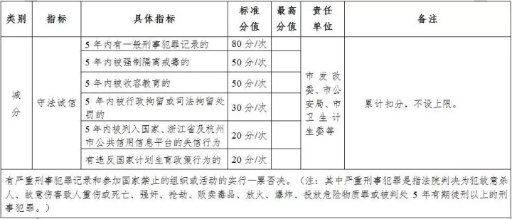 同时,对一般刑事犯罪、强制隔离戒毒的、收容教育、行政拘留或司法拘留处罚的及失信行为、违反国家计划生育政策行为等设置了扣分项,并有5年的追溯期限,最多的一次可扣80分,并实行累计扣分,不设上限。
