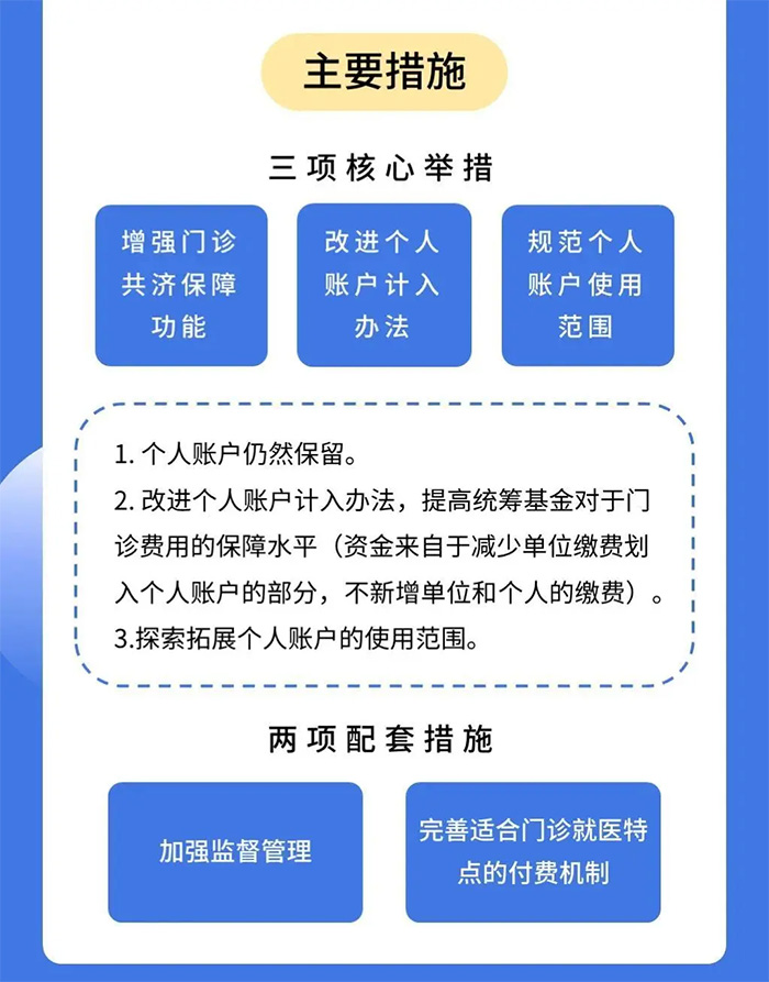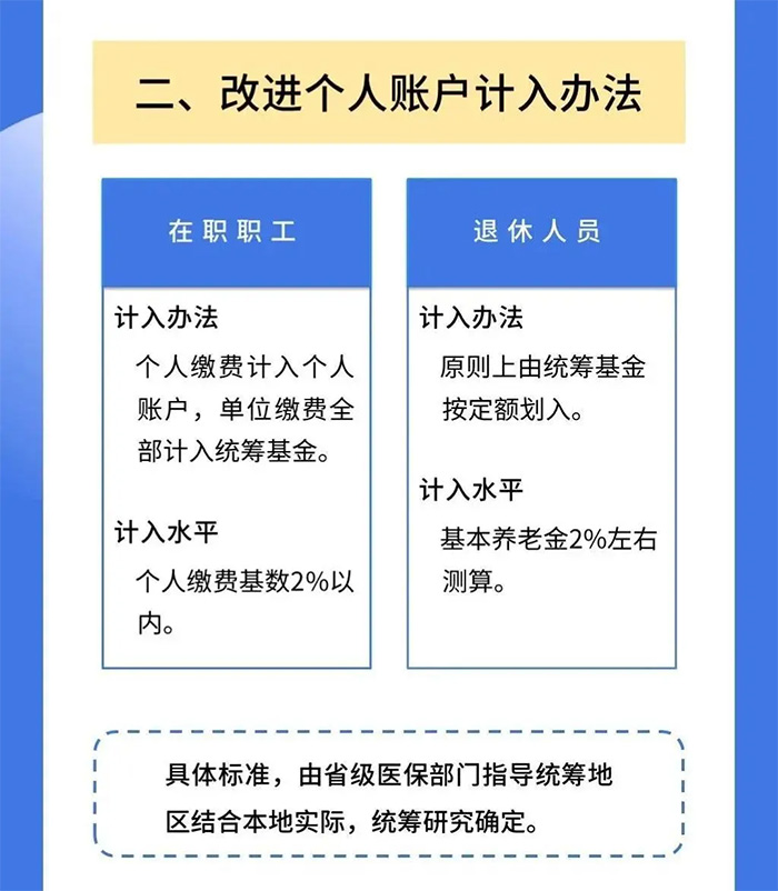 变化一:单位缴费拟不再进入个人账户 这个变化最直接的影响就是:个人账户的钱变少了。 大家都知道,职工医保账户分为统筹账户和个人账户两部分。 平时,我们每个月缴纳的医保费用由企业和我们自己共同承担,单位缴费金额为社保基数的9%(基本医疗保险)+1%(大额补贴),个人缴费金额则为社保基数的2%(基本医保)+3元(大额补助)。其中,自己缴纳的基本医疗部分,也就是社保基数的2%加上单位缴纳医保的一部分,根据年龄按照不同比例,计入个人账户。 看到这,相信很多朋友都会纳闷,个人账户的钱变少了,那我们门诊看病拿药该咋办呢?国家的考虑是不是有点不太周到呢? 其实并不是这样,因为少的那部分钱,实际上是被国家用来提升我们的医保待遇了,而这也是我们即将要说的第二个变化。