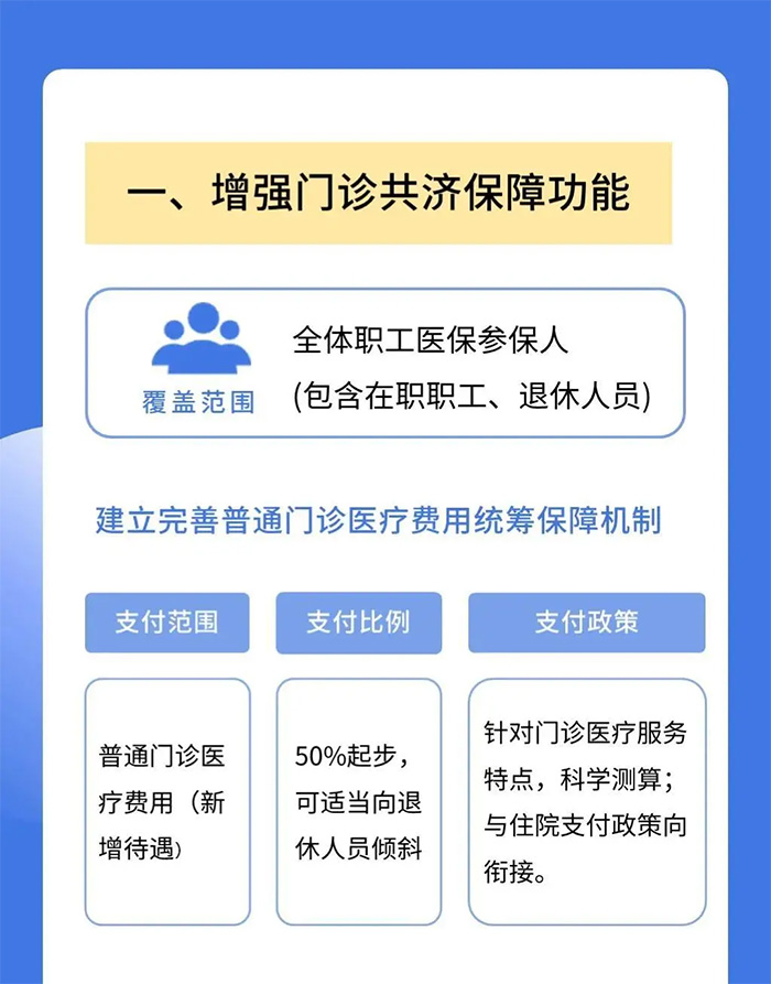 变化二:普通门诊费用拟纳入报销 这个变化最直接的影响就是:可以报销的费用变多了。 自1998年职工医保制度改革以来,我国的基本医保制度都是以保住院为核心,为住院提供比较高的待遇保障。 门诊保障这块,一直比较薄弱,目前只有北京、上海、深圳等一些经济比较发达的城市可以报销门诊。 其他地方的门诊费用主要依靠个人账户来支付,但是,大多数人的个人账户里并没有太多钱。 这也导致很多病人去住院,其实就为了吃药能报销。 因此,这次《征求意见稿》就提出要新增一项医保待遇:把一些门诊常见病纳入医保统筹基金支付范围,报销比例最低50%。 这样算下来,医保待遇不仅没有降低,而且是变得越来越好了!