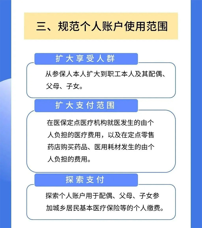 变化三:个人账户使用范围拟扩大范围 这个变化最直接的影响就是:个人帐户的使用范围扩大了。 医保卡属于个人卡,只能自己使用,如果外借给他人,很可能违规、违法。 目前只有少部分城市开放了医保卡家人共享功能,绝大多数城市依然禁止医保卡外借。 而国家医保局公布这份《征求意见稿》后,未来极有可能全国都会开放医保卡家人共享:不仅可以自己使用,也可以给配偶、父母和子女支付自付的医疗费,或者在药店给他们买药。 这样一来,以后我们医保个人帐户里用不上的钱,就可以拿来给爸妈看病拿药了,这样还能帮爸妈省点钱~ 下面一图带你了解医保大变化
