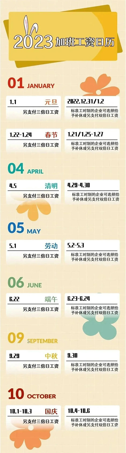 按照以上规定,具体到五一假期,我们要按以下方式计算标准工时制的加班工资。 今年5月1日(劳动节)是法定节假日,法律不允许调休,只要安排加班应支付不低于本人日工资的300%的工资报酬。 三倍工资计算公式: 5月1日(劳动节),即:月工资基数÷21.75÷8×加班小时数×300%。 二倍工资计算公式 4月29日、30日、5月2日、3日,即:月工资基数÷21.75÷8×加班小时数×200%。 员工拒绝加班用人单位能否解除劳动合同? 在现实生活中,很多公司会有一些不合理的加班需求,那员工可以拒绝吗?如果员工拒绝加班安排,公司可以以不服从加班安排为由解除劳动合同吗? 一、员工可以拒绝加班安排吗? 这个要看具体情况。 一般情况下,员工可以拒绝加班,依据是《劳动法》第41条的规定: 用人单位由于生产经营需要,经与工会和劳动者协商后可以延长工作时间。 从该条规定来看,加班需要协商一致,若用人单位单方安排,劳动者同意是可以的;劳动者不同意加班的,也是可以的。 但特殊情况下,员工应服从加班,依据是《劳动法》第42条的规定: 《劳动法》第四十二条 有下列情形之一的,延长工作时间不受本法第四十一条规定的限制: 发生自然灾害、事故或者因其他原因,威胁劳动者生命健康和财产安全,需要紧急处理的; 生产设备、交通运输线路、公共设施发生故障,影响生产和公众利益,必须及时抢修的; 法律、行政法规规定的其他情形。 需要指出的是,用人单位生产经营需要,一般不属于上述特殊情况。 二、劳动者拒绝加班,公司可以以不服从加班安排为由解除劳动合同吗? 根据《中华人民共和国劳动法》第四十一条规定: 用人单位由于生产经营需要,经与工会和劳动者协商后可以延长工作时间,一般每日不得超过一小时;因特殊原因需要延长工作时间的,在保障劳动者身体健康的条件下延长工作时间每日不得超过三小时,但是每月不得超过三十六小时。 第四十三条规定: 用人单位不得违反本法规定延长劳动者的工作时间。 也就是说,用人单位安排员工加班,也是有时间限制的,每天不能超过1小时,每个月不能超过36小时。 根据《中华人民共和国劳动合同法》第二十六条规定: 下列劳动合同无效或者部分无效: ……(三)违反法律、行政法规强制性规定的。 为确保劳动者休息权的实现,我国法律对延长工作时间的上限予以明确规定。 用人单位制定违反法律规定的加班制度,在劳动合同中与劳动者约定违反法律规定的加班条款,均应认定为无效。 根据《中华人民共和国劳动法》第四条规定: 用人单位应当依法建立和完善规章制度,保障劳动者享有劳动权利和履行劳动义务。 法律在支持用人单位依法行使管理职权的同时,也明确其必须履行保障劳动者权利的义务。 用人单位的规章制度以及相应工作安排必须符合法律、行政法规的规定,否则既要承担违法后果,也不利于构建和谐稳定的劳动关系、促进自身健康发展。 为了方便大家理解,我们来看个详细案例: 王某于2019年5月1日入职某劳务派遣公司处,双方签订书面劳动合同,合同期限为2019年5月1日至2022年4月30日,派遣公司派遣王某至某办事处从事专职网格员工作,王某月工资为2800元。 2021年7月27日劳务派遣公司以“未认真落实街道工作安排且7月17日、18日两天无故缺勤旷工,严重违反工作纪律及规章制度,性质恶劣”与王某解除劳动合同。 办事处陈述2021年7月17日、18日因为全国部分地市疫情出现紧急状况,按照省市防疫工作通知申请人加班,但未提交省市防疫部门的有关通知。 仲裁委员会认为,加班应有其必要性和合理性,办事处在紧急情况下,如突发事件,可以要求申请人加班,但是在日常情况下,申请人享有休息的权利,有权拒绝不正当理由加班,因此认定申请人7月17日、18日申请人不属于旷工,劳务派遣公司违法解除劳动合同,应支付违法解除劳动合同赔偿金。(部分引用人力资源社会保障部和最高人民法院联合向社会公布劳动人事争议典型案例(第二批)) 附2023年加班工资日历