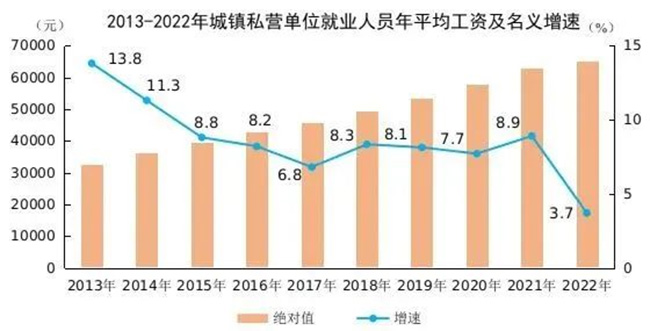 2022年全国城镇非私营单位就业人员年平均工资为114029元,比上年增加7192元,名义增长6.7%。扣除价格因素,2022年全国城镇非私营单位就业人员年平均工资实际增长4.6%。