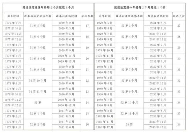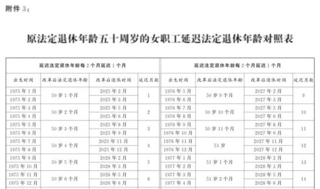 二、原法定退休年龄为五十周岁的女职工 根据《国务院关于渐进式延迟法定退休年龄的办法》规定: 从2025年1月1日起,原法定退休年龄为五十周岁的女职工,法定退休年龄每二个月延迟一个月,逐步延迟至五十五周岁。国家另有规定的,从其规定。 原法定退休年龄为五十周岁的女职工延迟法定退休年龄对照表,如下图所示↓