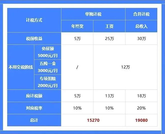 下面来简单说一下可能导致少退的注意事项: ▪️子女教育:需要注意各阶段衔接时有空档,比如小学升初中,6月毕业,9月才开学,这中间有人可能就漏掉了,因为我们可能会习惯沿用上一年的记录,所以升学期记得要改专项扣除资料。 ▪️继续教育:本科及以下在读,没有工作的,父母可以用来抵税; ▪️大病医疗:并没有想象中的门槛那么高,个人自费或自付15000~80000之间的可以扣除。 ▪️房贷抵扣个税:可以夫妻分别抵扣或单人抵扣,最好让工资高的一方单人抵扣; 2、 年终奖“单独计税”:巧妙选择高收益 年终奖发放月份不同,可能影响清算结果。比如去年 12 月份发的,那我们今年 3 月就要记得清算;如果今年 1 月才发,那就明年清算的时候再处理。 年终奖很多朋友再熟悉不过了,而这笔钱并不是发多少就能实收多少的,因为它也是需要交税的。 在2027年12月31日前,年终奖可以选择两种计税方式,分别是: 单独计税:年终奖和工资分开,分别计算该交多少税; 合并计税:年终奖和工资合并,按总收入一共来计税; 那两种方式选哪种?我们接着往下看; 以王先生税前年入25万,其中,五险一金要扣3000元,每月还有2000元专项额度扣除,加上今年的年终奖5万,将单独计税与合并计税的差异演示如下: