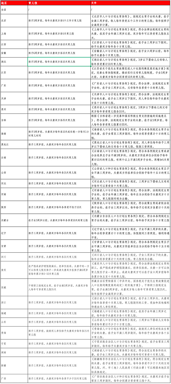 育儿假工资计算方法 一、关于育儿假的相关规定 随着各省市《人口计划与生育条例》的修改,大多数省份明确了育儿假。 详情可查看下表