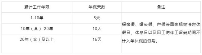 年假工资计算方法 一、关于年假的相关规定 根据《职工带薪年休假条例》国务院令第514号,第二条,职工连续工作1年以上的,享受带薪年休假。 其中的连续工作1年,后续出台的条例中有一些调整,根据《企业职工带薪年休假条例》第四条,年休假天数根据职工累计工作时间确定。职工在同一或者不同用人单位工作期间,以及依照法律、行政法规或者国务院规定视同工作期间,应当计为累计工作时间。 所以年假的条件应按照累计工作时间计算,只要累计工作时间1年及以上,就符合年休假规定。 具体年假天数的规定可查看下表: