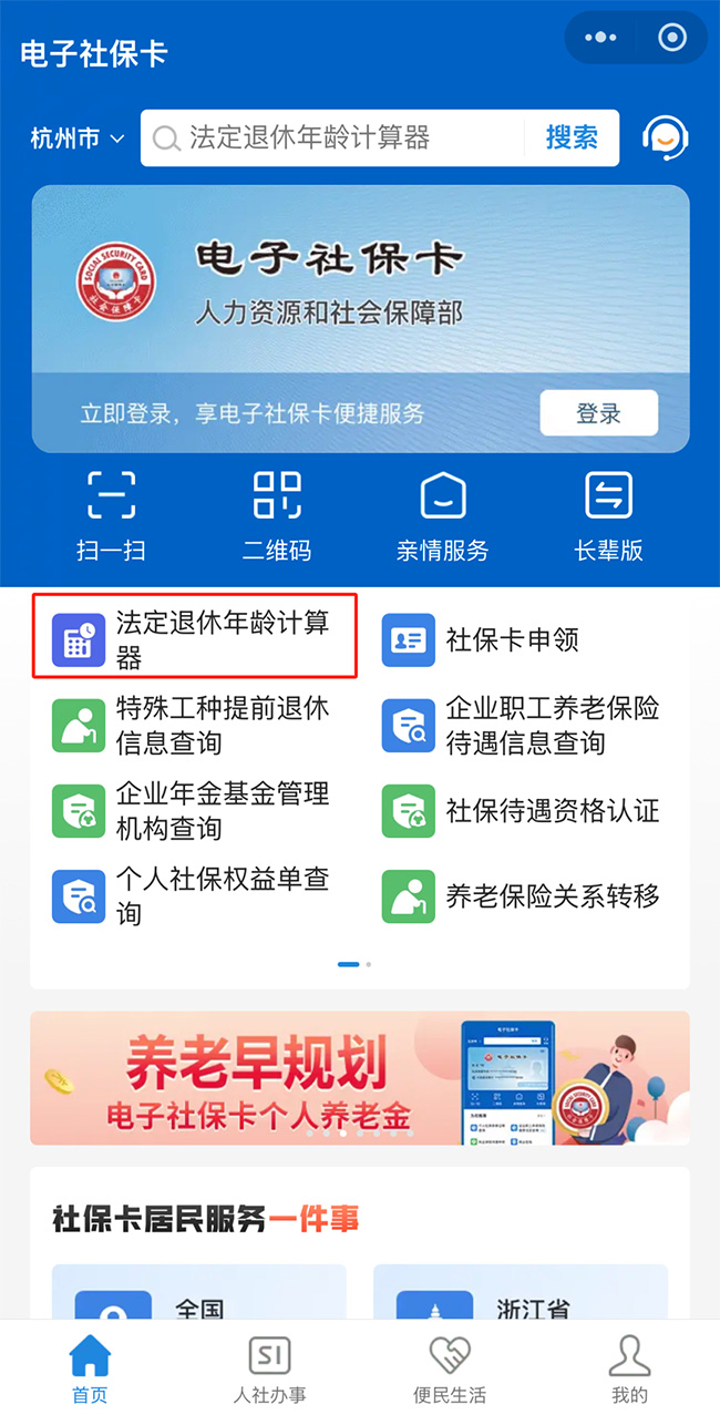 2、本人对应的法定退休年龄查询 参保人员查询本人法定退休年龄,可以通过4个人力资源和社会保障部的官方线上服务渠道查询: (1)国家社会保险公共服务平台; (2)全国人社政务服务平台; (3)电子社保卡; (4)“掌上12333”APP。 通过上述途径访问“退休年龄计算器”,输入本人的出生日期、性别等信息,即可查询对应的法定退休年龄和退休年月。