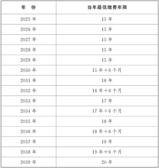 此外,参保人员还可以通过拨打12333咨询服务热线、前往社会保险经办机构服务窗口等线下方式,查询本人法定退休年龄。 3、关于最低缴费年限 2029年12月31日前,职工按月领取基本养老金最低缴费年限仍为15年。 从2030年1月1日起,按照每年提高6个月的节奏,将职工按月领取基本养老金最低缴费年限由15年逐步提高至20年。 提高最低缴费年限情况表: