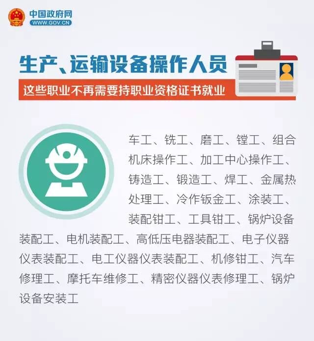 近日,国务院简政放权再下一城——人社部决定对原劳动保障部《招用技术工种从业人员规定》(劳动保障部令第6号)予以废止。6号令规定了90个持职业资格证书就业的职业,包括车工、汽车修理工、营业员、美容师、美发师、摄影师、家政服务员、秘书等。 这项《规定》废止后,对没有法律依据的准入类职业,社会组织和用人单位将不得实行就业准入,不得要求劳动者持证上岗。 减少职业资格许可和认定事项,一直是国务院推进简政放权、放管结合、优化服务的重要内容,李克强总理也多次强调,要以改革释放创业创新活力。 这项《规定》的废止,将对我们的生活带来什么改变?哪90种职业将不再需要“资格证”?